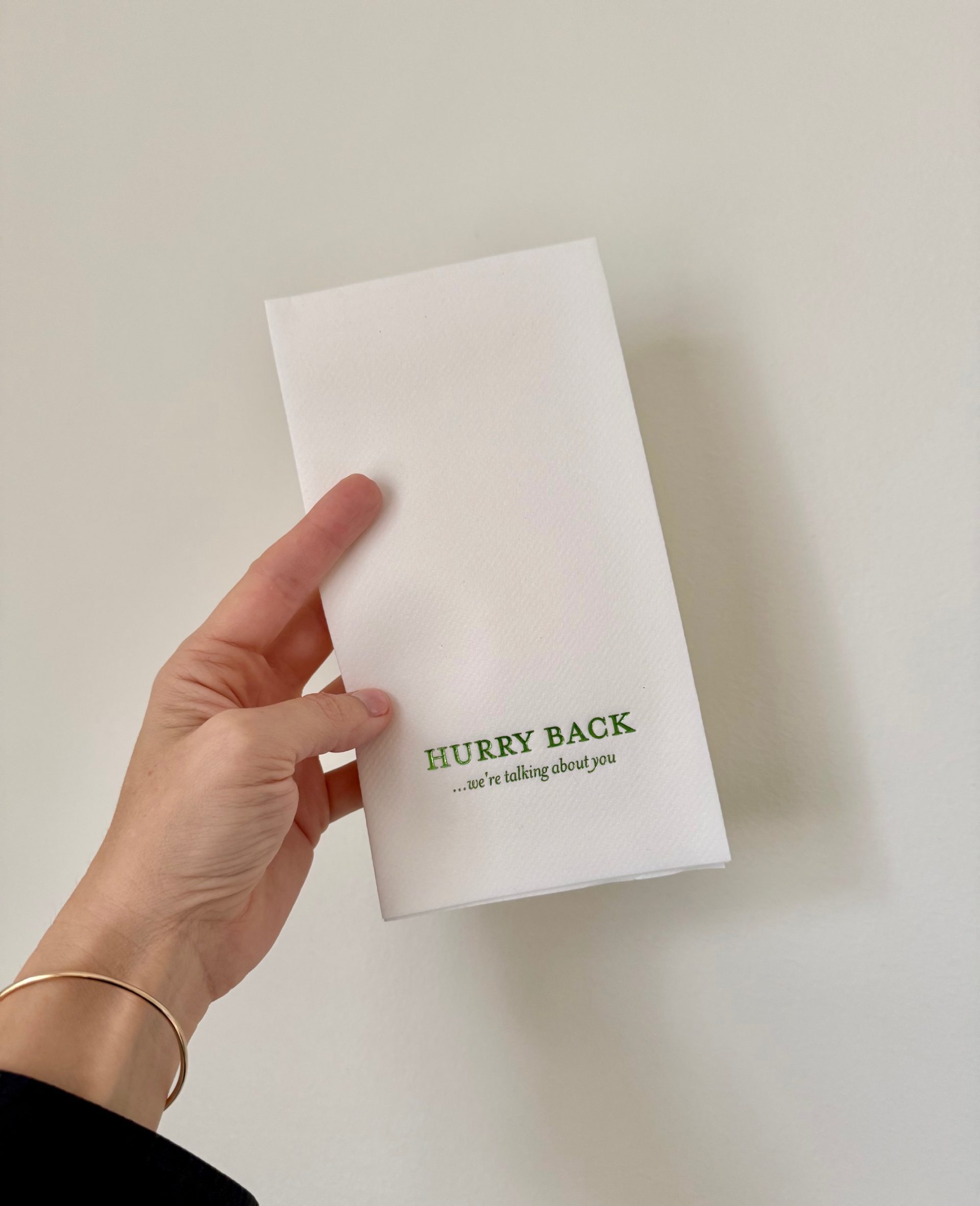 OOPS…our printer’s mistake is your gain!! Limited supply of these our new guest towels that add a touch of humor to your powder room! “Hurry Back…we’re talking about you” is printed in a shiny green foil on our luxe, linen-like guest towels. Let your guests know that their presence is valued—and playfully imply that their absence is noticed—with these unique and amusing paper hand towels.
